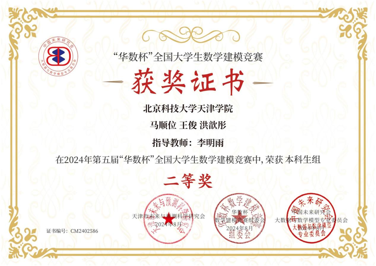 近日,2024年第五届“华数杯”全国大学生数学建模竞赛结果公布,伟德官网新材料2201班马顺位、自动2201班王俊和新材料2202班洪歆彤三位同学,在李明雨老师的指导下,荣获全国二等奖。