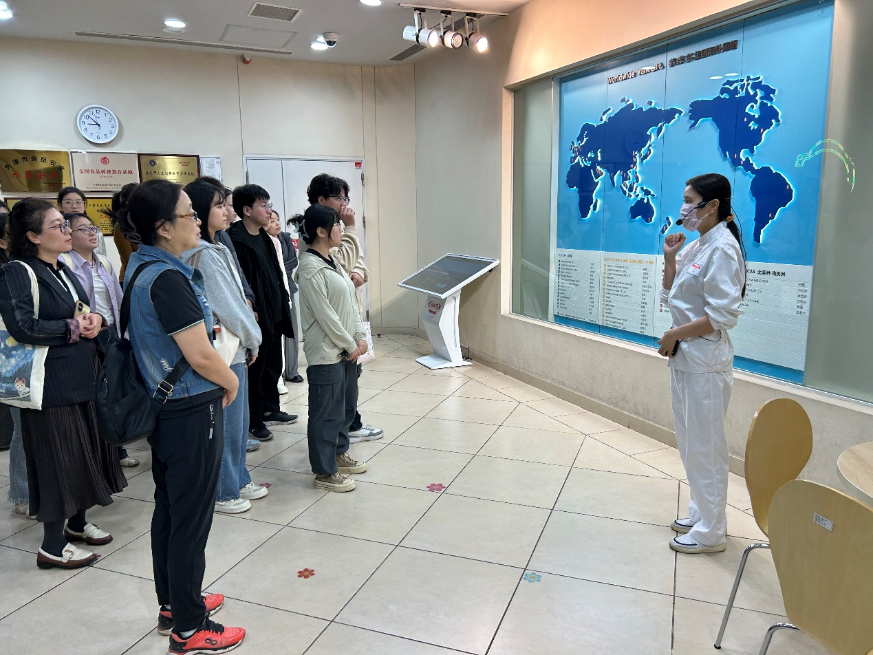 此次赴企业参观,大家首先在工作人员的引领下参观了养乐多企业和产品介绍展厅,随后师生观看了视频介绍并与工作人员进行了互动交流,最后沿着培养室、品质管理室、成形室、充填室和包装室等逐一进行了生产线观摩。