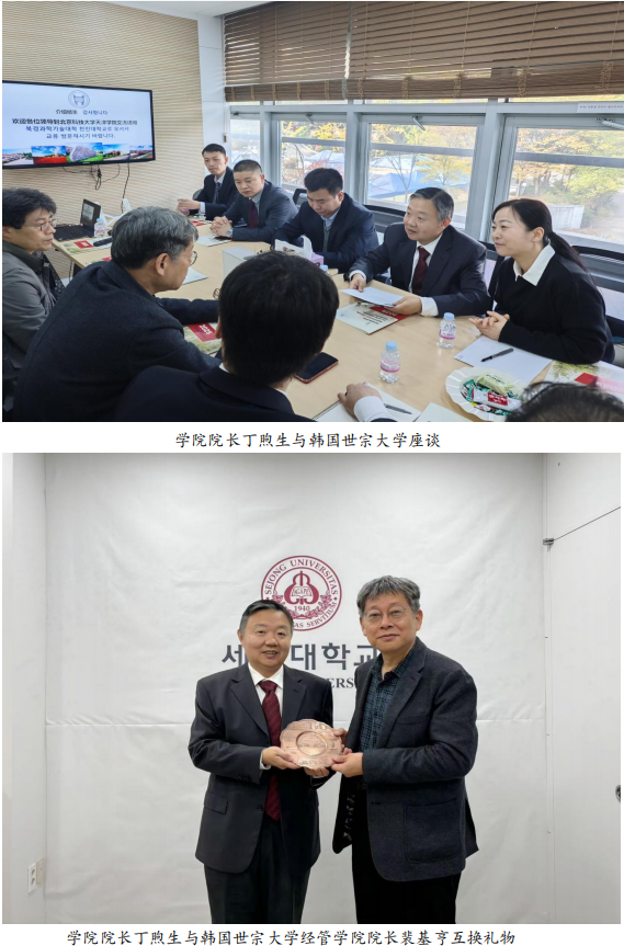 11月5日,丁煦生院长一行对韩国世宗大学进行走访。在交流座谈会上,韩国世宗大学经管学院院长裴基亨详细介绍了相关专业硕士及博士生项目、院校间跨国课题的申请及学术合作等,丁煦生院长介绍了学院基本情况,并强调双方要结合专业特色,进一步加强交流合作。双方就推动国际化人才培养交换了意见。
