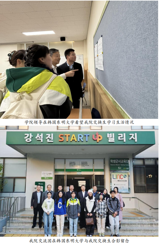 11月6日,丁煦生院长一行前往韩国东明大学进行访问并看望伟德官网在东明大学交换生。双方就进一步加深两校合作项目进行了详细的探讨交流,表示将瞄准各校优势学科和团队,进一步探索合作模式、拓宽合作渠道,共同推动中韩高校间优势学科的交流和发展。随后,丁院长一行与交换生进行了座谈交流。丁院长详细了解了同学们在韩学习与生活情况,鼓励他们积极进取,珍惜在韩学习的宝贵机会,为未来发展积蓄力量。座谈结束后,交流团一行参观走访了学生教室、宿舍、图书馆等学生日常学习生活场所。