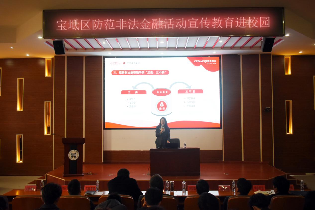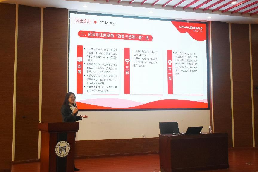 浙商银行天津分行合规部高级经理张琳以“金融为民谱新篇·守护权益防风险”为主题,通过对“非法集资”、“套路贷”、“电信网络诈骗”、“反电信网络诈骗法”的深入解析,总结了“八个凡是”、“三个不要”、“六个一律”的安全提示,着力提升广大师生防骗“免疫力”。