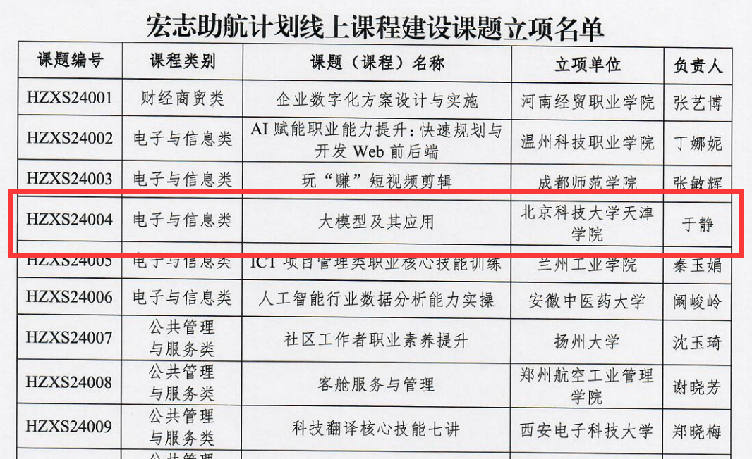近日,教育部学生服务与素质发展中心公布“宏志助航计划”线上课程建设课题立项名单,由信息工程学院副院长于静教授主持申报的《大模型及应用》课程获批立项,为我校首次获得该项目立项。项目组成员来自无人系统与具身智能、大数据技术与AIGC应用2支教科研团队以及合作企业—中软国际的人工智能技术专家。