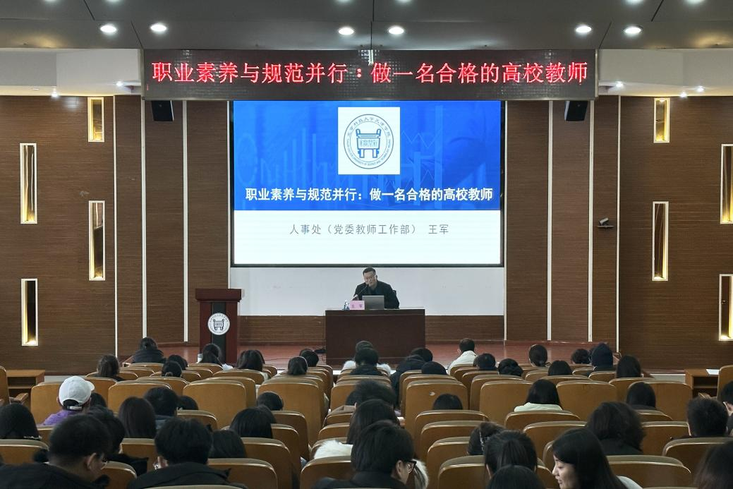 为确保新入职教职工迅速融入学院工作环境,熟悉学院工作规范及人事管理制度,明确岗位职责,12月18日下午,学院在理工馆学术报告厅开展2024年新入职教职工岗前培训第十六讲,邀请党委教师工作部部长、人事处常务副处长王军教授作题为“职业素养与规范并行:做一名合格的高校教师”的专题培训。全体新入职教职工参加培训。