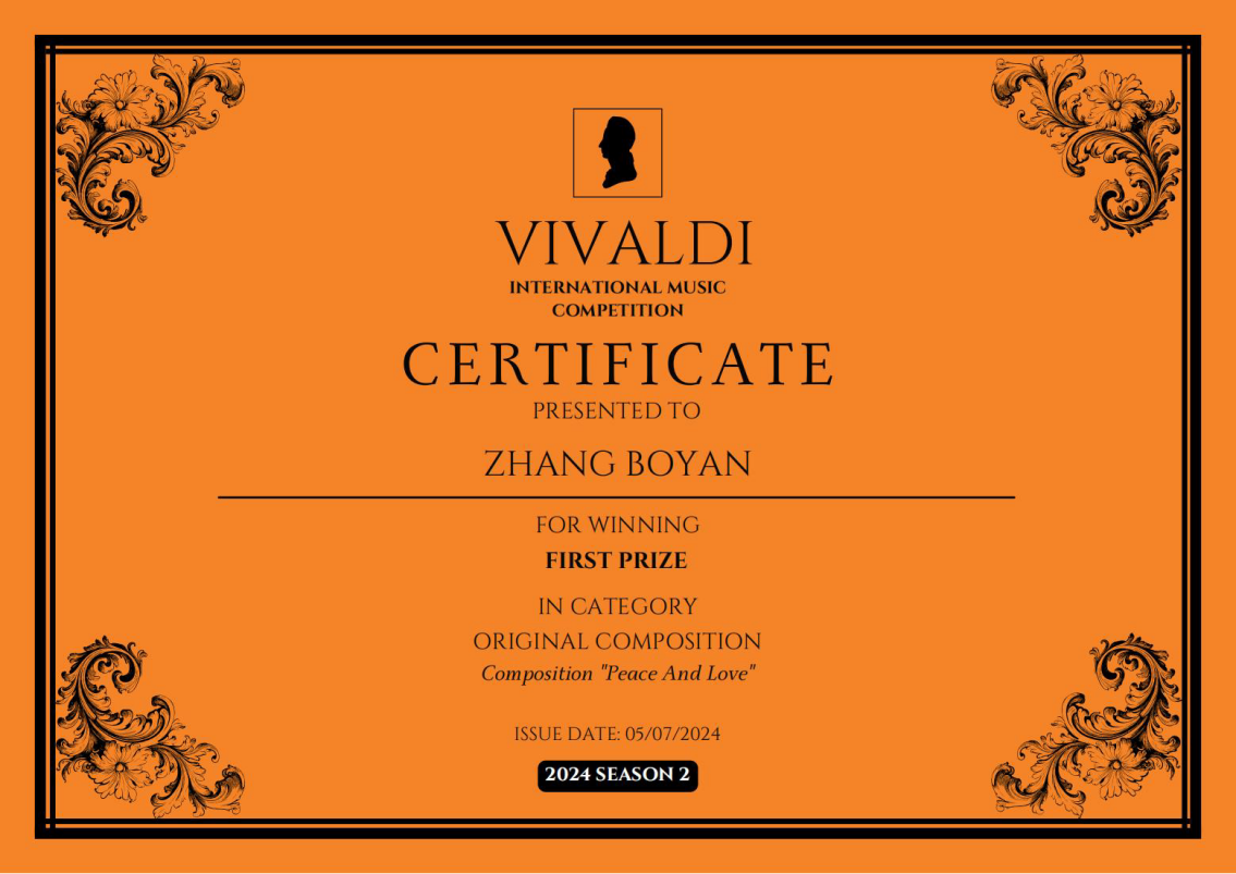 学生张博研荣获2024年“维瓦尔第”国际音乐比赛一等奖